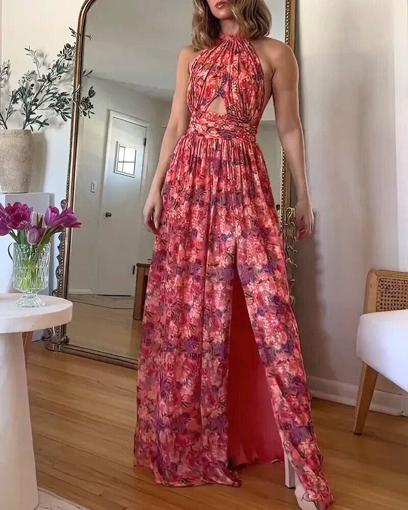 This maxi dress features a vibrant floral pattern in shades of pink, orange, and purple, perfect for making a memorable statement.