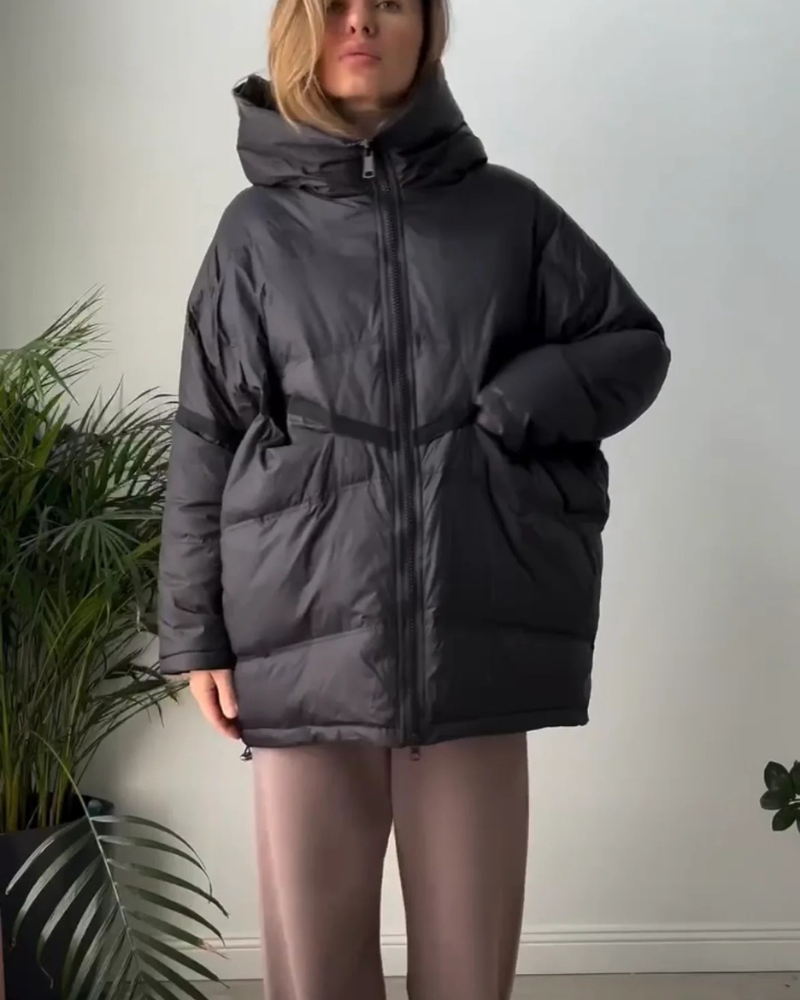 The oversized hood and secure zipper closure make it the perfect functional layer for everyday wear, offering both protection and personality.