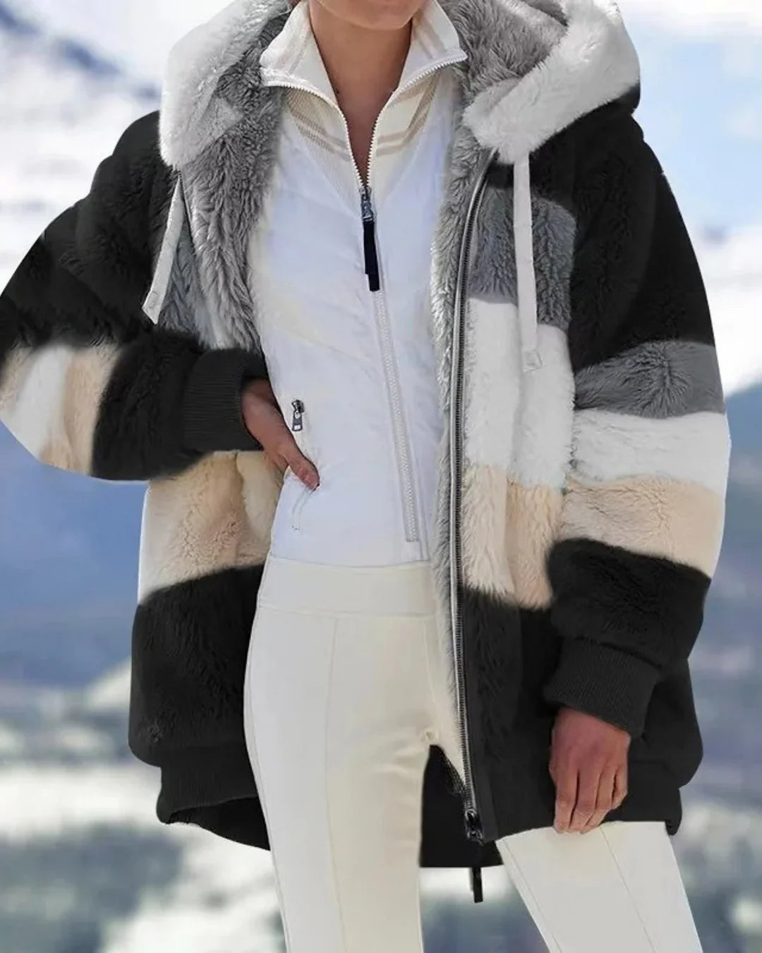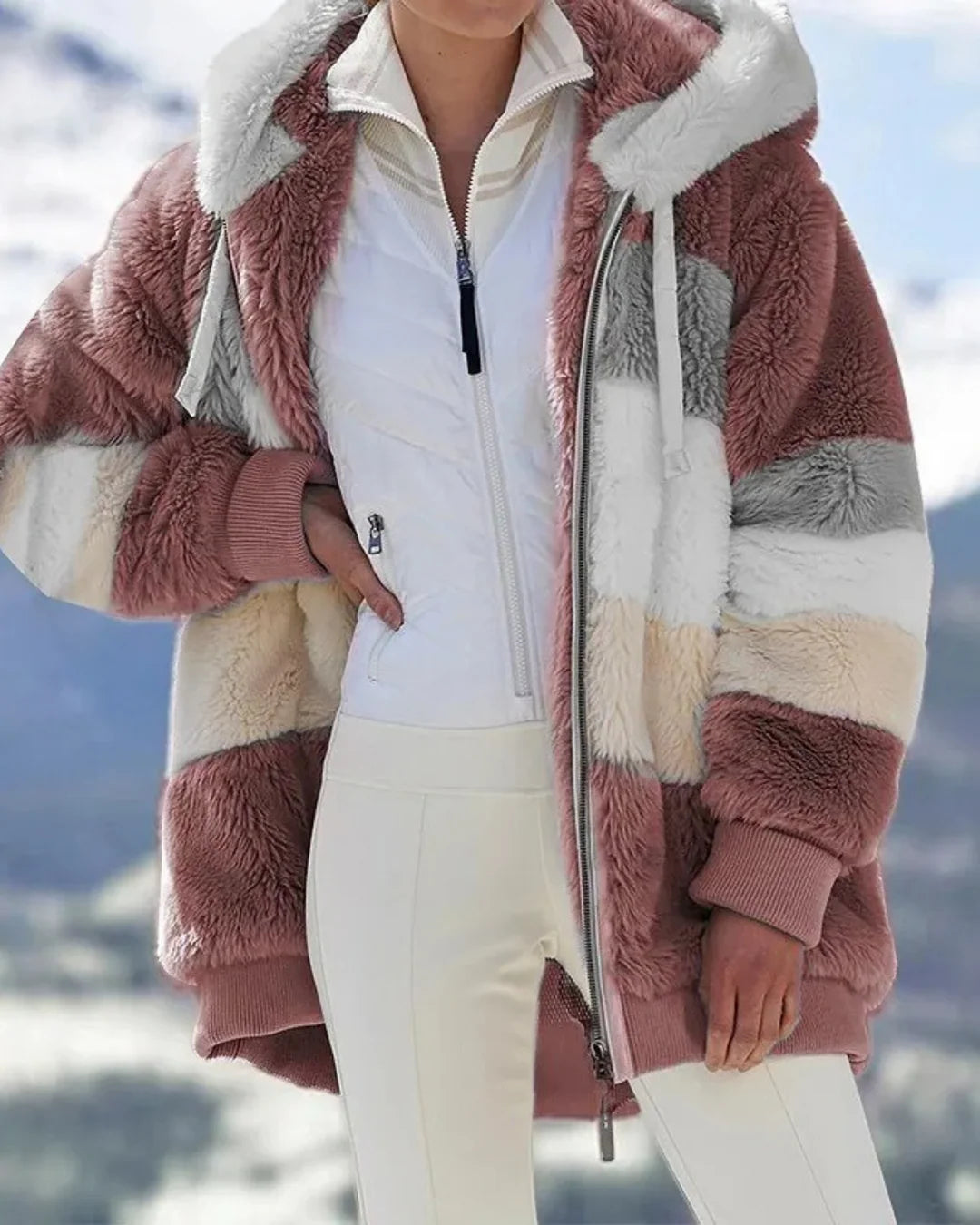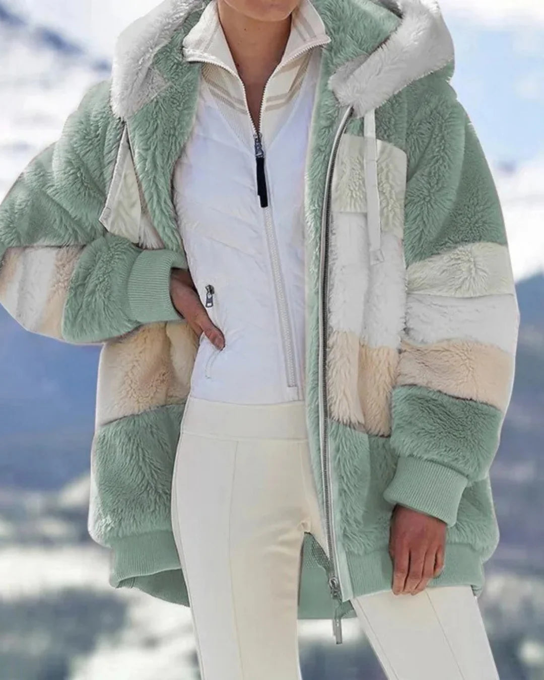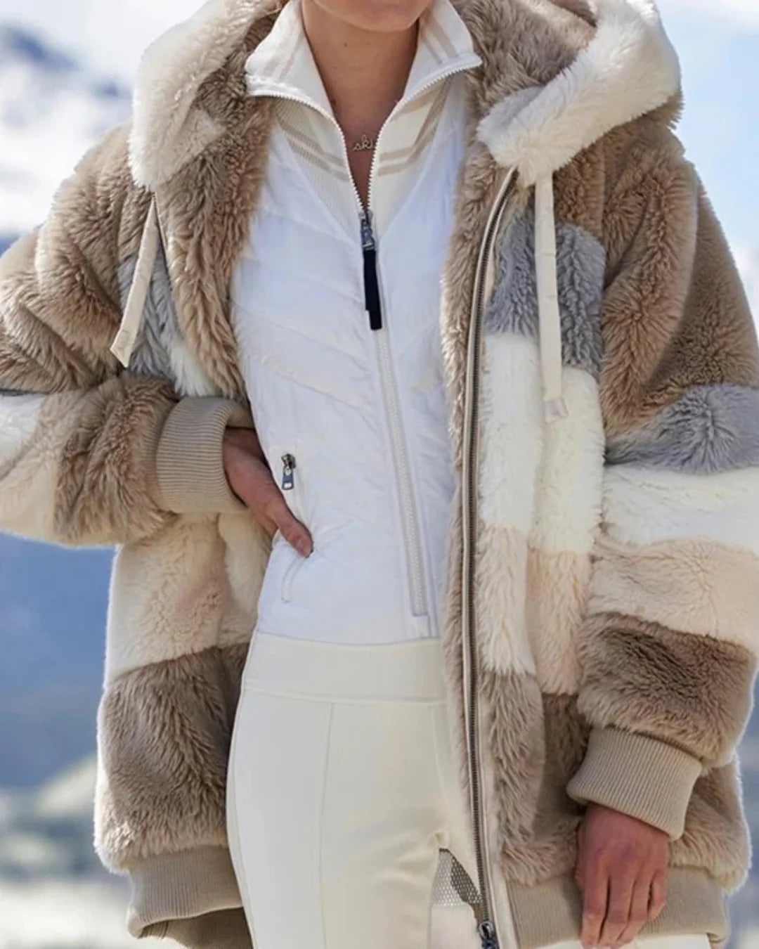 Wrap yourself in cozy luxury with the ZAIDA Stylish Plush Coat, the perfect blend of warmth and chic design. This ultra-soft plush coat features a soothing palette of pastel blue, cream, and soft gray color blocks, making it both fashionable and functional for colder days.