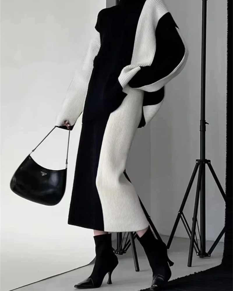 The relaxed oversized sweater and matching midi skirt create a sleek, elongated silhouette that flatters every figure while offering a refined, effortless look.