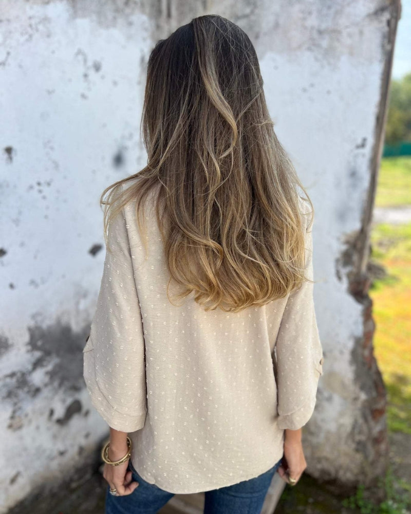 Designed with rolled-up buttoned sleeves and a relaxed silhouette, this blouse offers the perfect balance of elegance and comfort.
